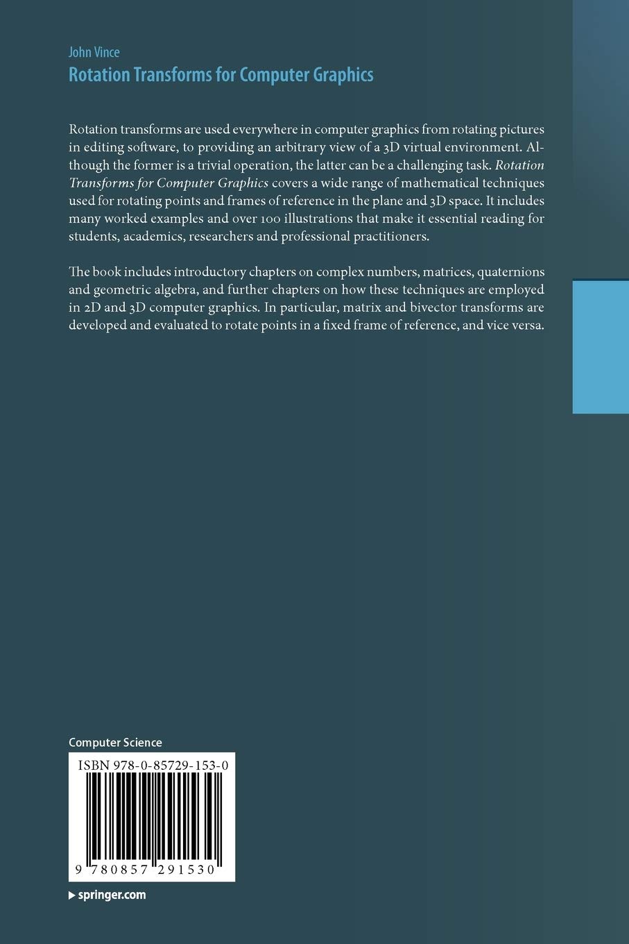 - Rotation Transforms For Computer Graphics Vince John 9780857291530 Amazon Com Books - Rotation Transforms Are Used Everywhere In Computer Graphics From Rotating Pictures In Editing Software, To Providing An Although The Former Is A Trivial Operation, The Latter Can Be A Challenging Task.